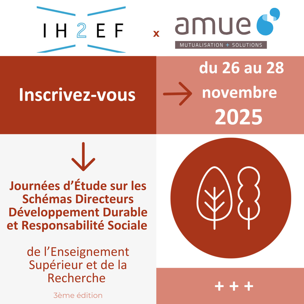 Participez aux 3ᵉ Journées d’étude sur la mise en œuvre des schémas directeurs développement durable et responsabilité sociétale (SD-DD&RS), organisées sous l’égide du Haut fonctionnaire au développement durable du MESR, de l’AMUE et de l’IH2EF, en partenariat avec France Universités, la CGE, la CDEFI, l’association VP TREE et le CIRCES.