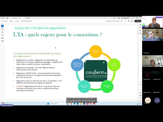 Sébastien Perrin, conservateur et directeur de la bibliothèque de Mines Paris, a présenté les enjeux des IA génératives pour l’édition scientifique et l’accès à l’information académique, ainsi que les premières réflexions du consortium Couperin sur la mise en place d’un “système d’IA de confiance” pour l’ESR.